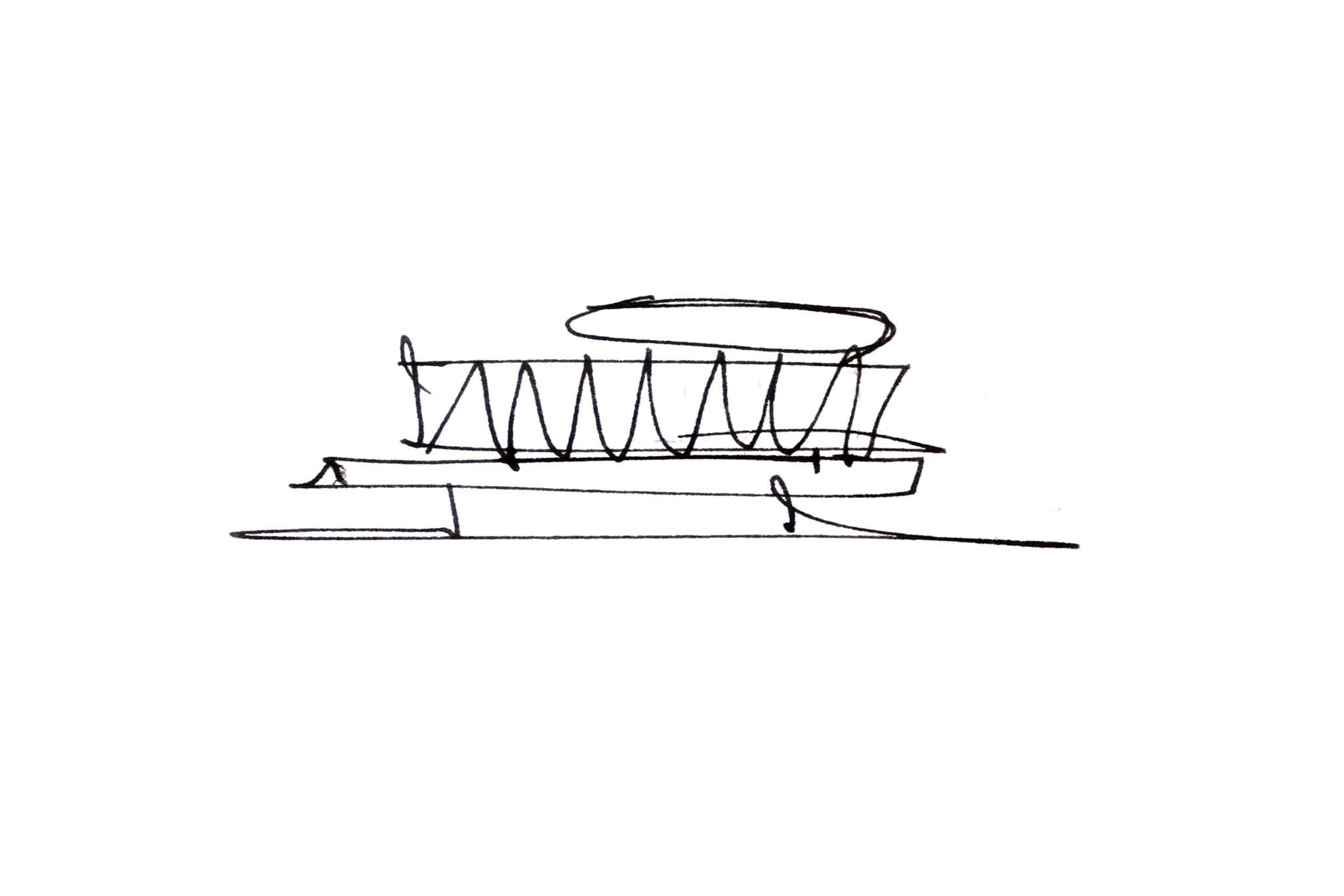 La volumetría en dos niveles, con un cuerpo inferior sólido y un espacio superior más ligero y transparente, crea un contraste entre lo robusto y lo etéreo.