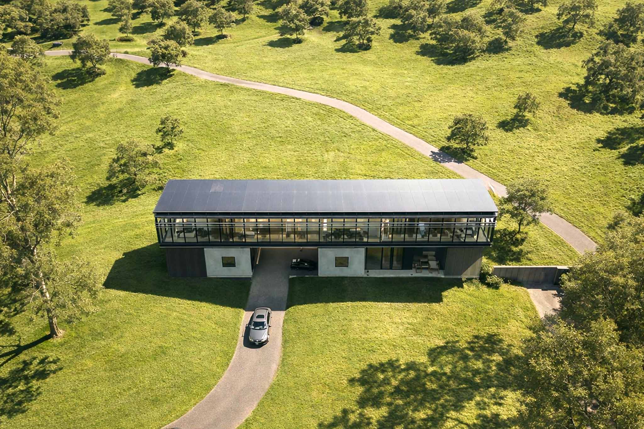 El entorno es clave: un paisaje sereno, de árboles altos y cielo amplio, que parece aceptar la presencia de esta estructura como si siempre hubiese estado allí.