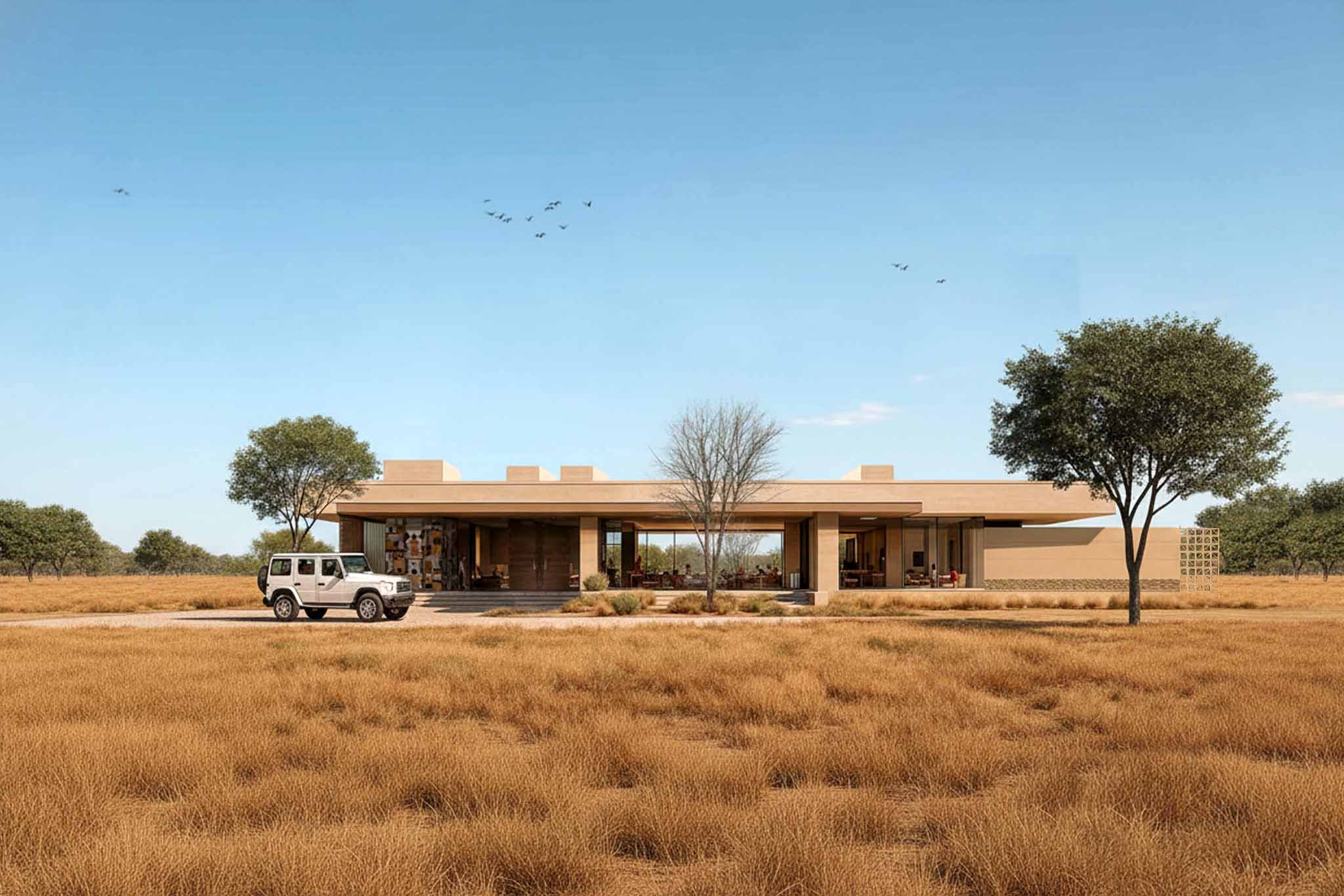 La estructura, anclada en la tierra pero abierta al cielo, parece extenderse como una contemplación materializada: un refugio de claridad y propósito en medio del campo.