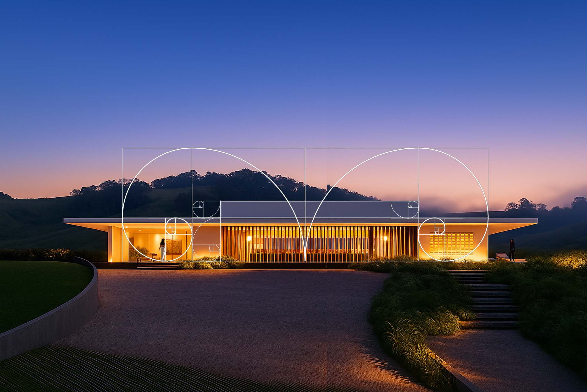 La arquitectura, de líneas horizontales puras y volúmenes limpios, se arraiga al terreno como una extensión natural del paisaje ondulado que la rodea.