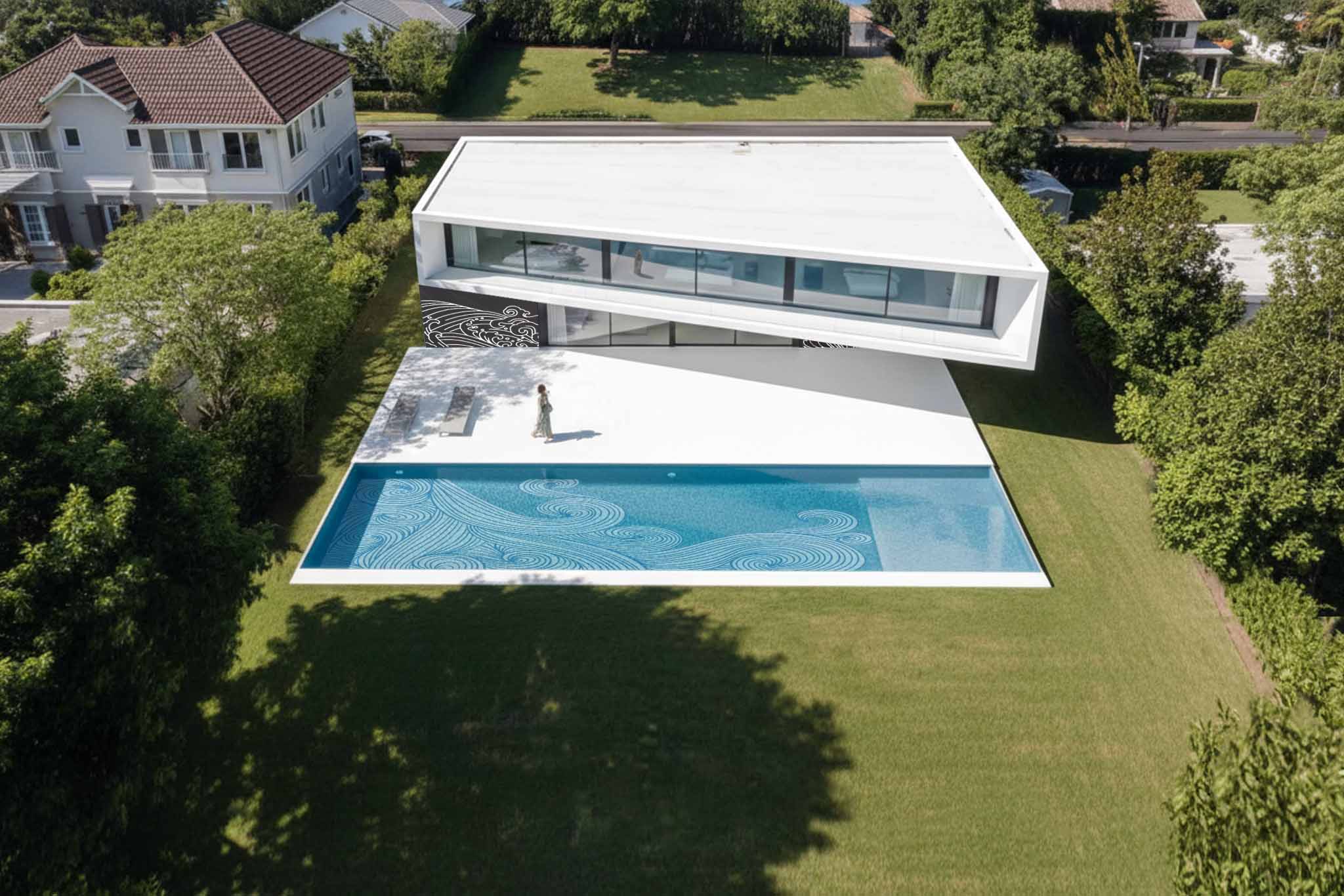 La horizontalidad del volumen suspendido transmite estabilidad, pausa