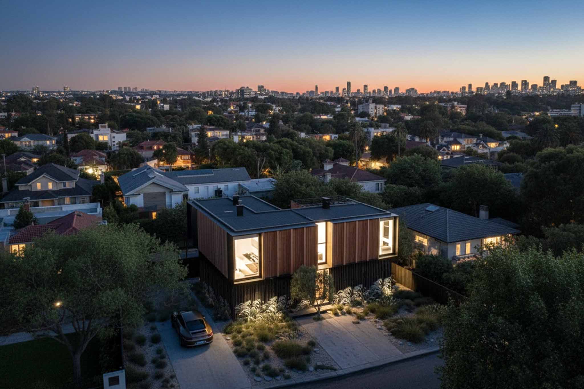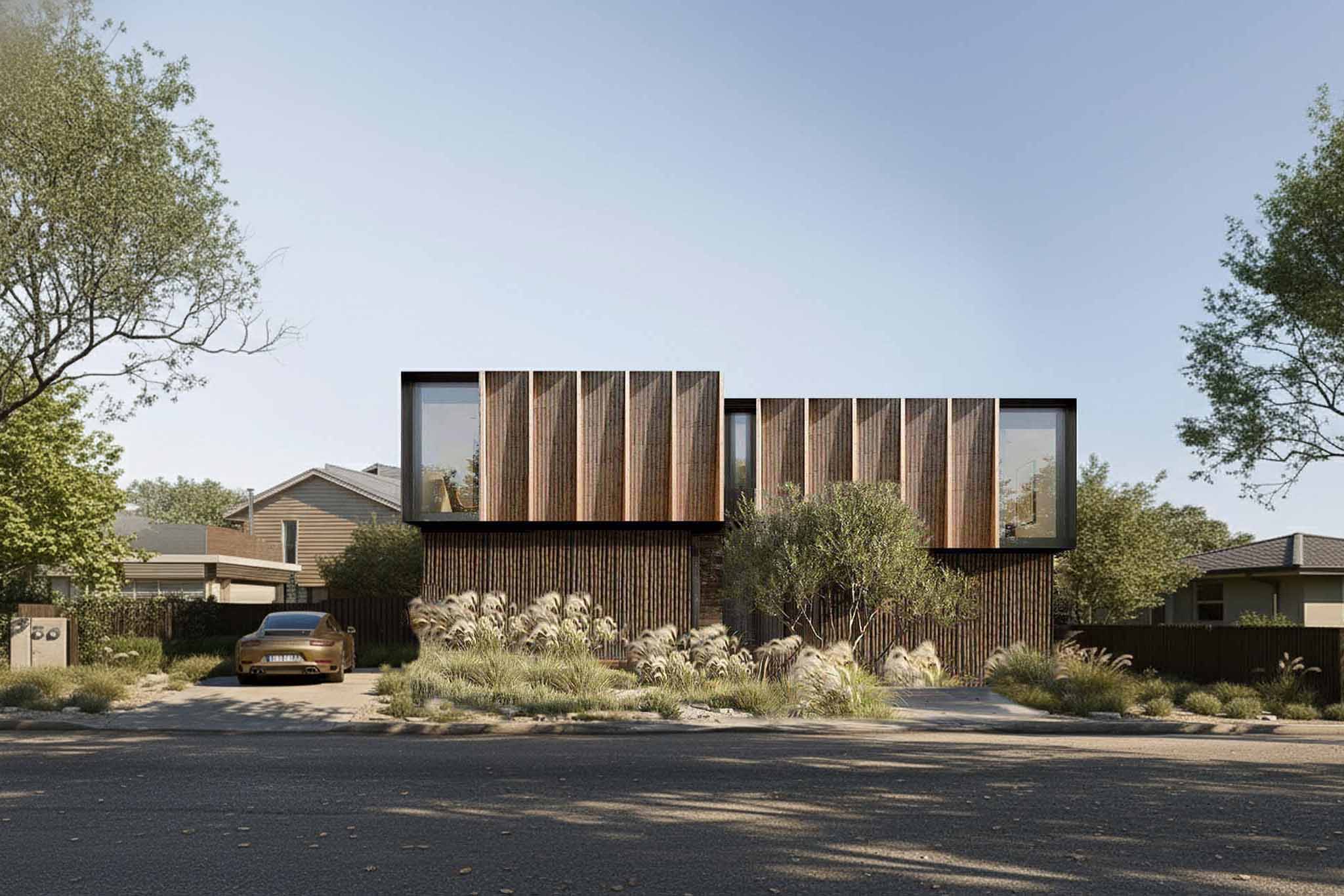 Su volumen compacto, revestido en madera vertical, se pliega en ritmo y sombra, generando una fachada dinámica que respira con la luz.