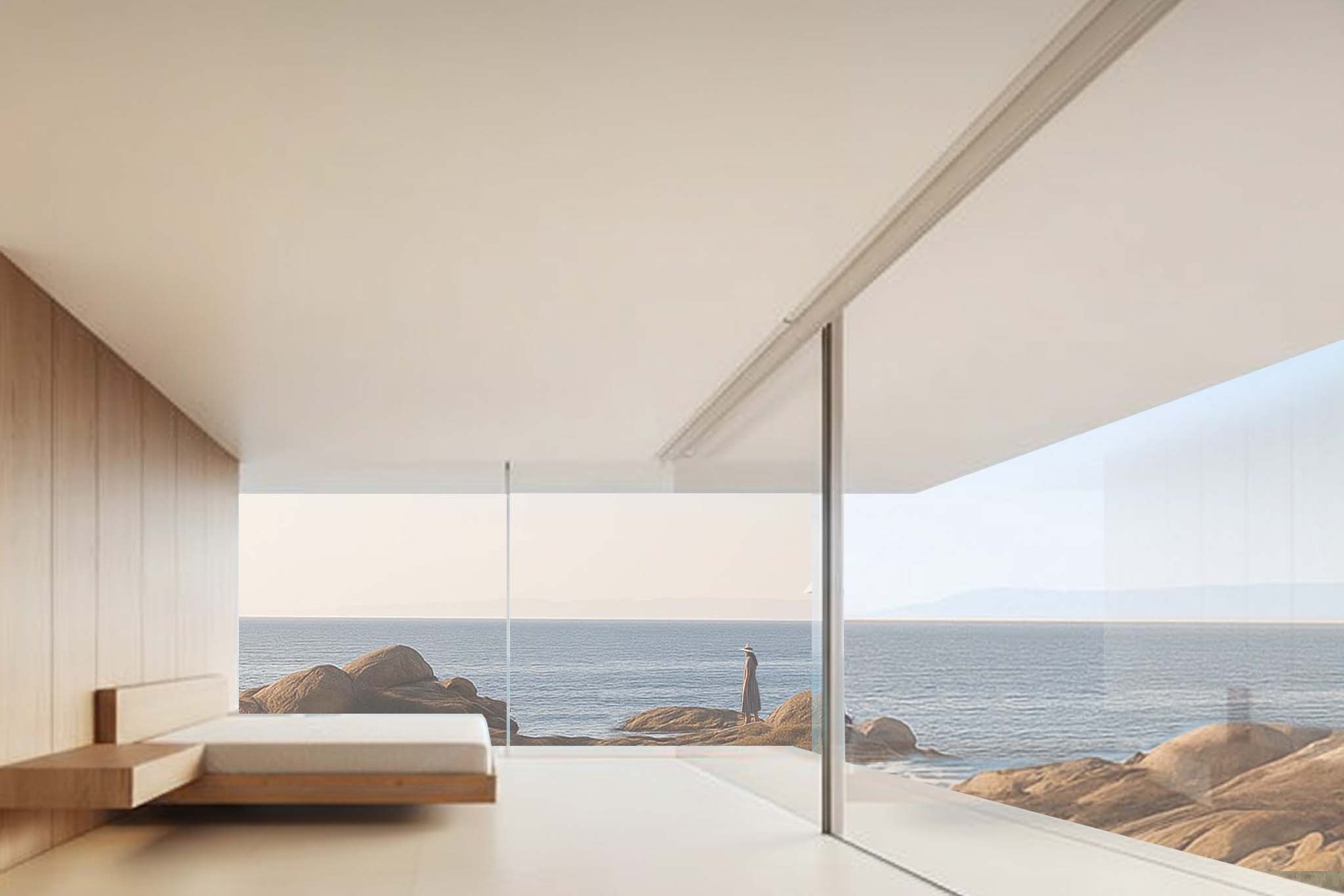 Un volumen blanco, minimalista y suspendido, que se abre completamente al horizonte marino, creando continuidad entre interior y exterior.