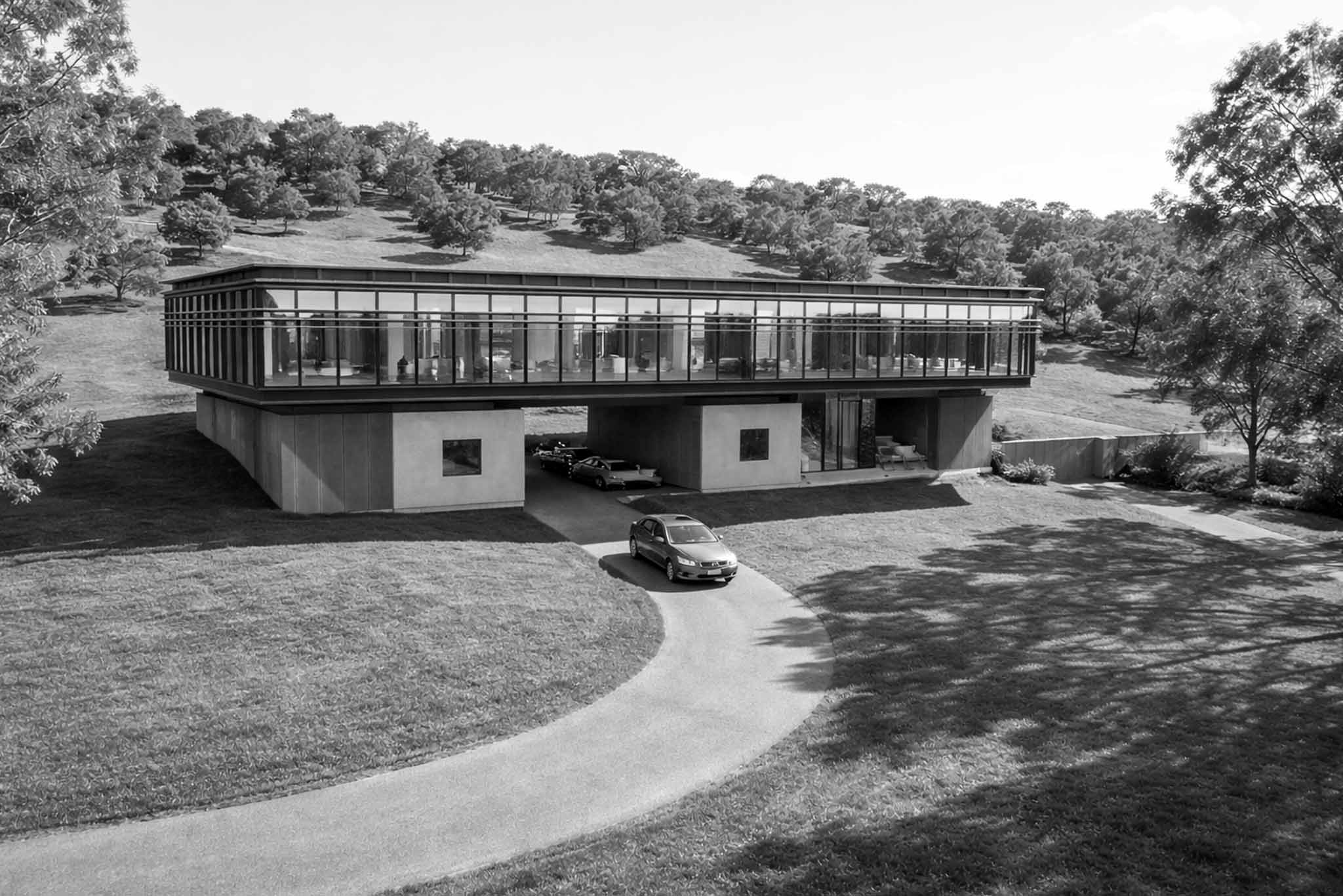 El entorno es clave: un paisaje sereno, de árboles altos y cielo amplio, que parece aceptar la presencia de esta estructura como si siempre hubiese estado allí.