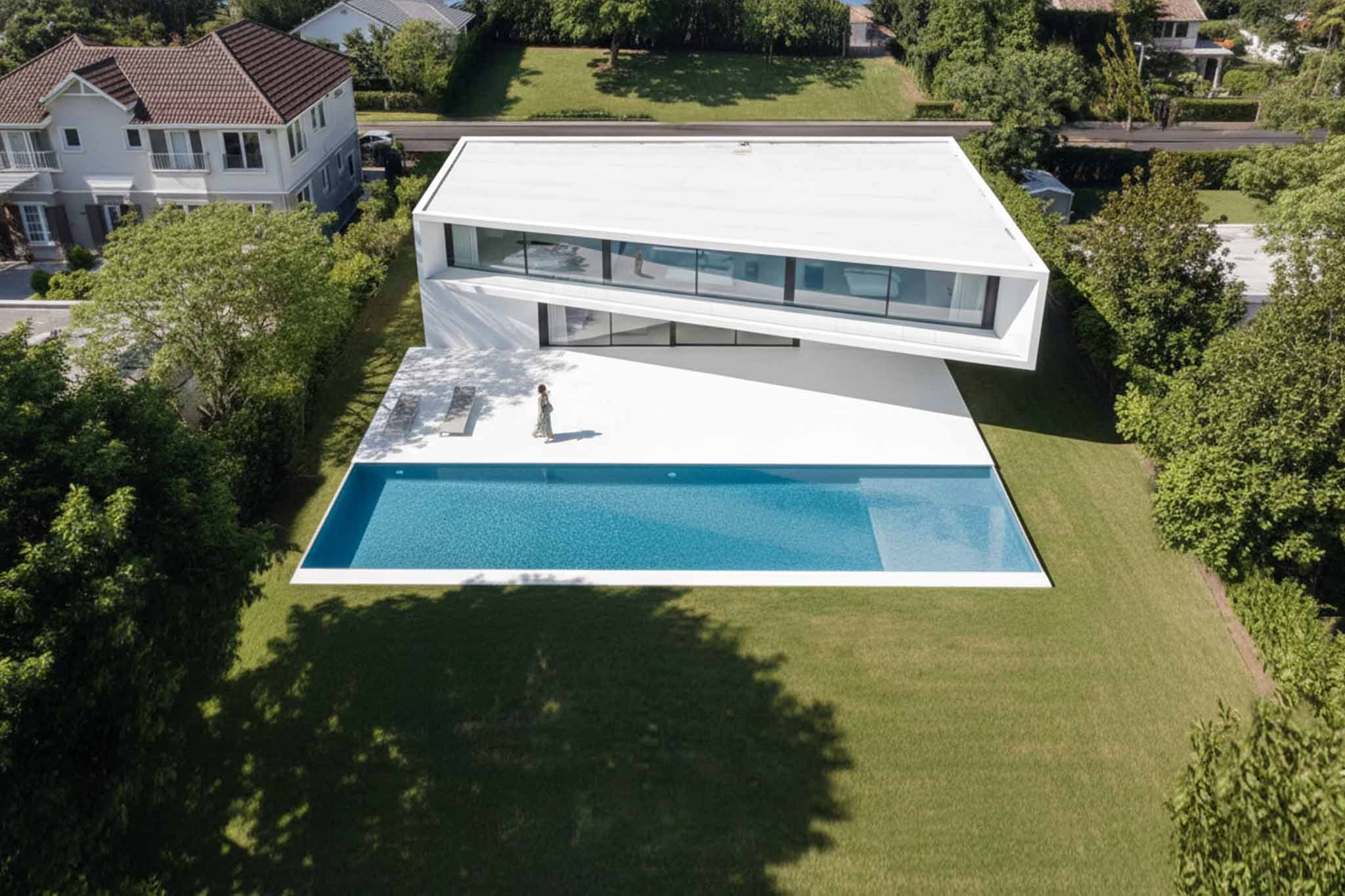 La horizontalidad del volumen suspendido transmite estabilidad, pausa