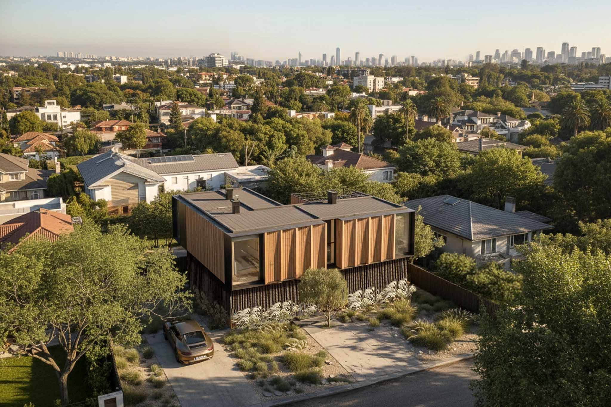 Su volumen compacto, revestido en madera vertical, se pliega en ritmo y sombra, generando una fachada dinámica que respira con la luz.