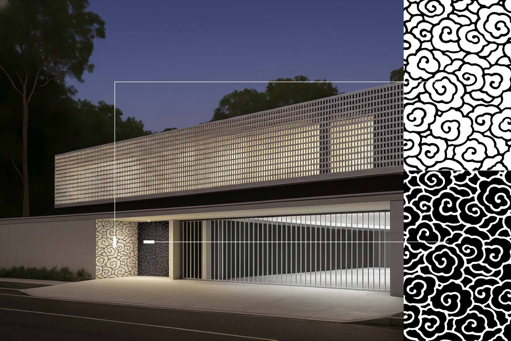 Su volumen superior, suspendido y envuelto en celosías regulares, filtra la luz y las vistas, generando un límite visual entre interior y exterior.