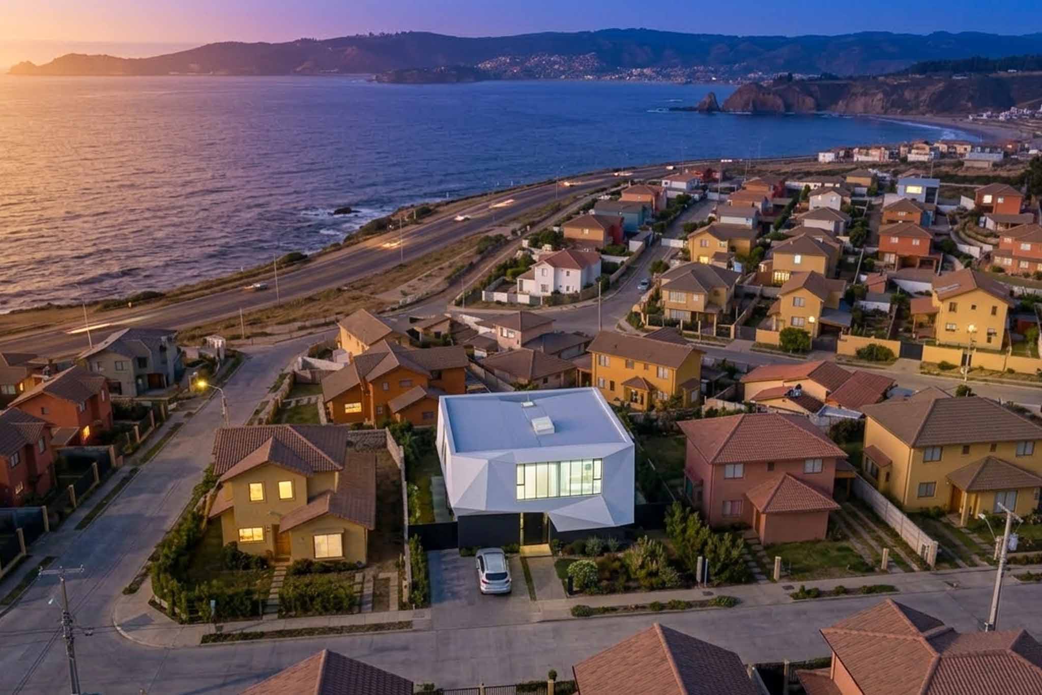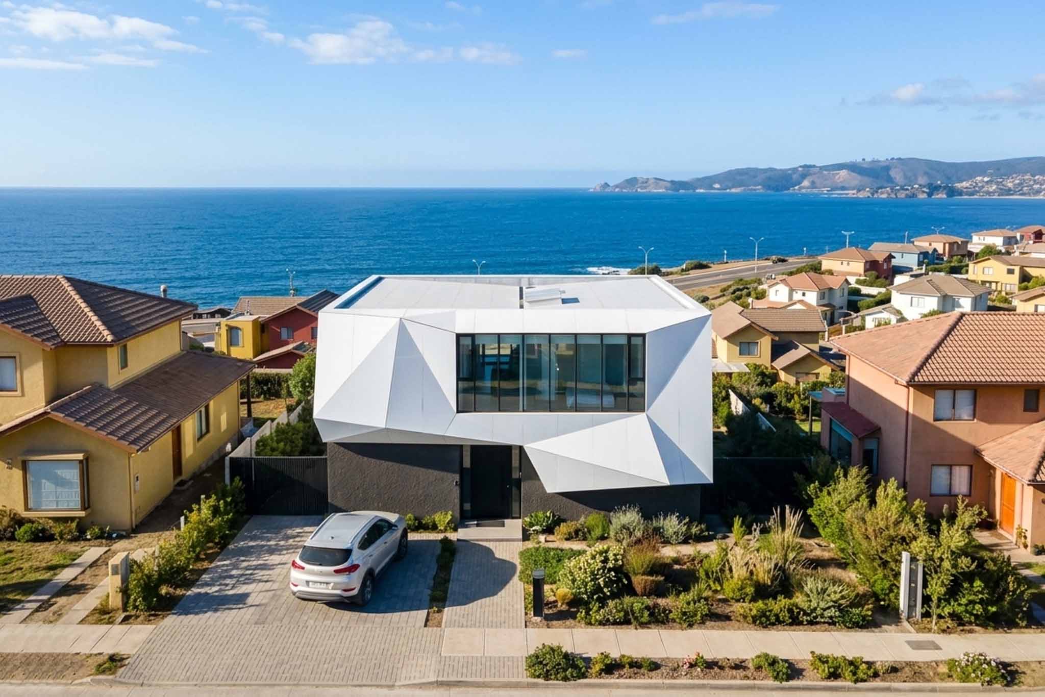 Al asentarse sobre una base sólida y oscura, la casa establece un diálogo entre la estabilidad terrenal y una aspiración geométrica hacia lo etéreo, convirtiendo el acto de habitar en una experiencia de observación introspectiva y conexión profunda con el horizonte infinito.