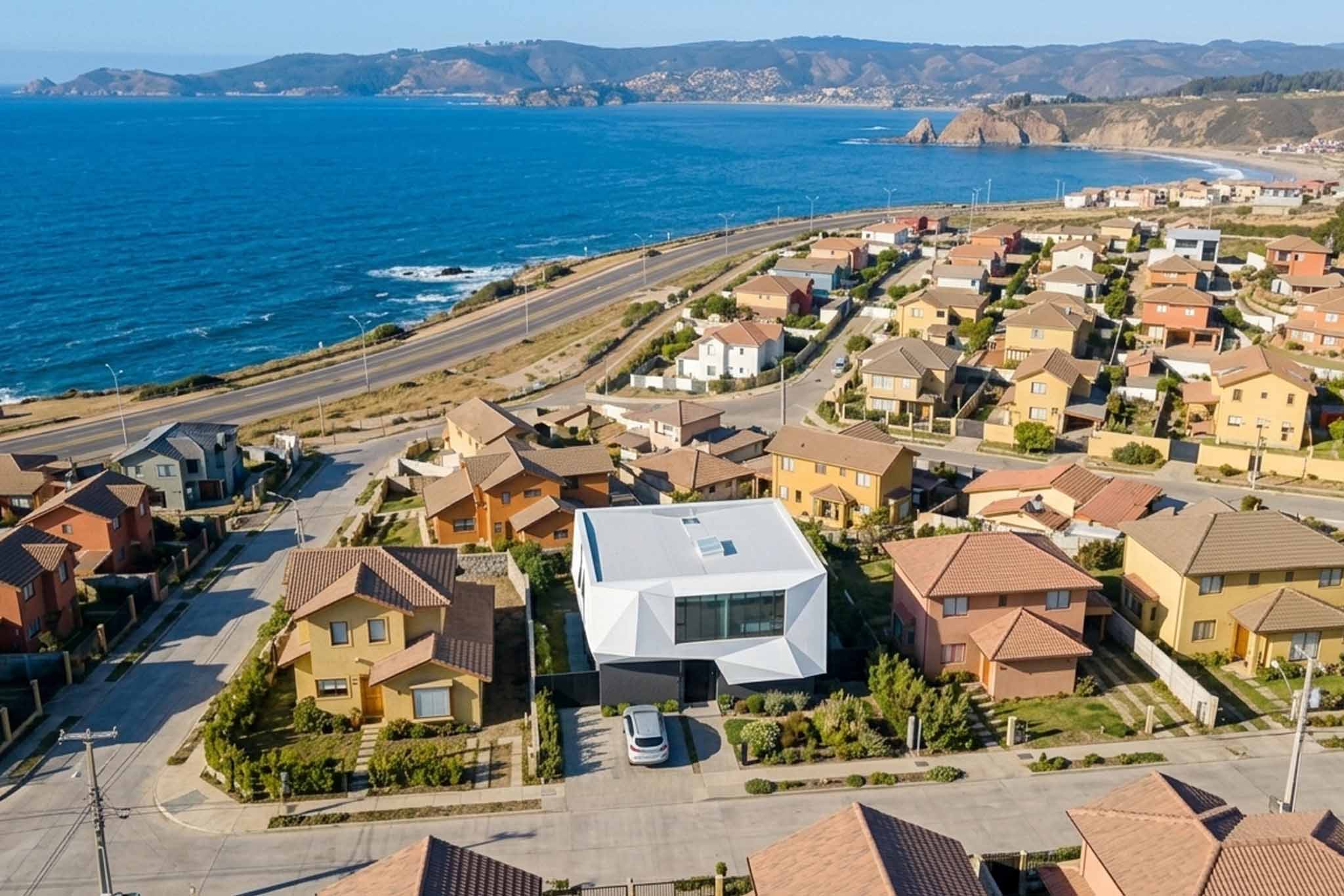 Esta arquitectura espiritual se define como un cristal facetado que emerge del terreno, actuando como un faro de conciencia frente a la inmensidad del océano. Su volumetría blanca y angulosa simboliza una pureza que se quiebra para captar la luz desde múltiples perspectivas, sugiriendo que la verdad y la iluminación son multidimensionales.