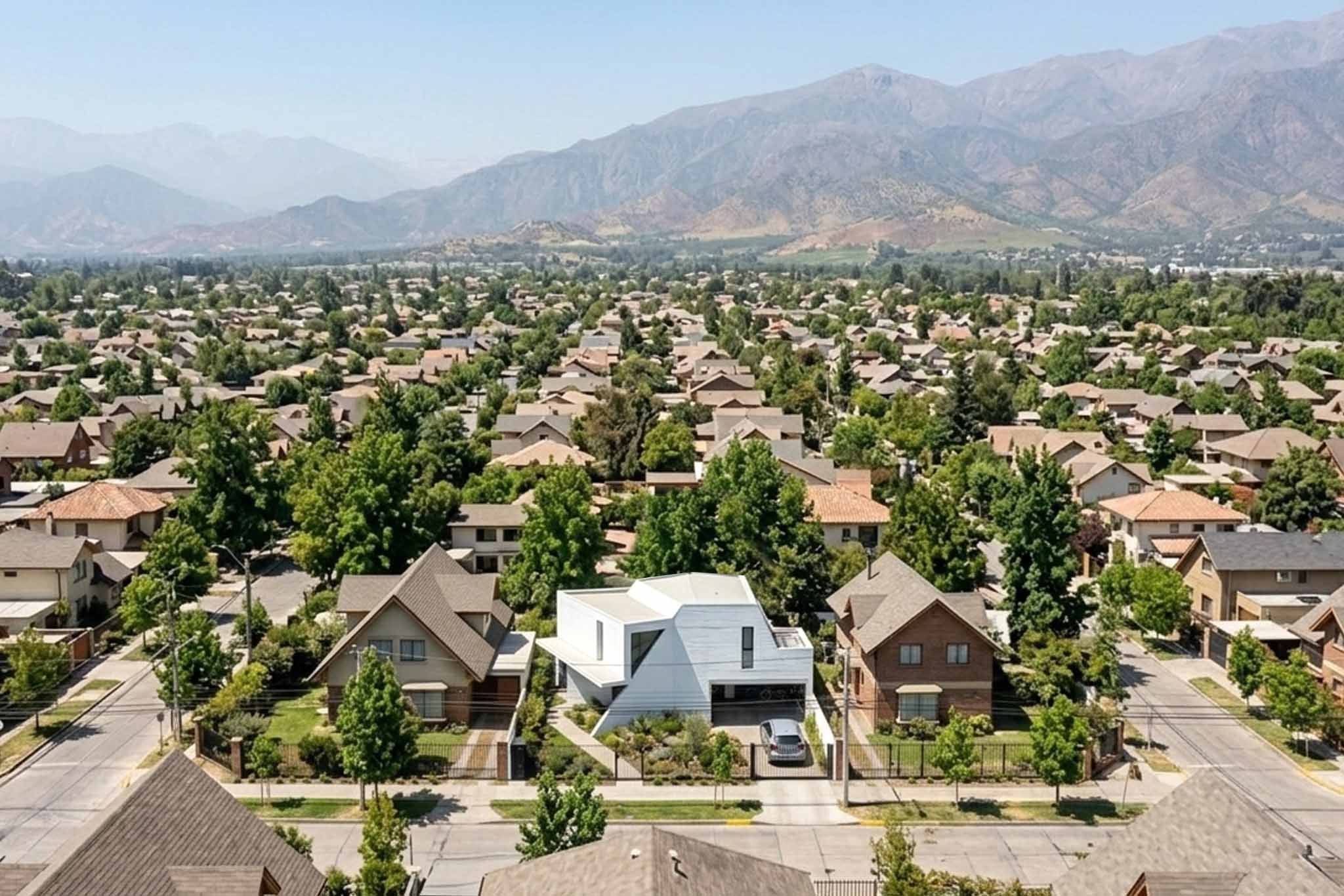 La casa se abre al jardín mediante transparencias y planos geométricos, generando una atmósfera de calma moderna donde la arquitectura se convierte en un refugio luminoso, íntimo y profundamente conectado con el paisaje urbano y la cordillera.