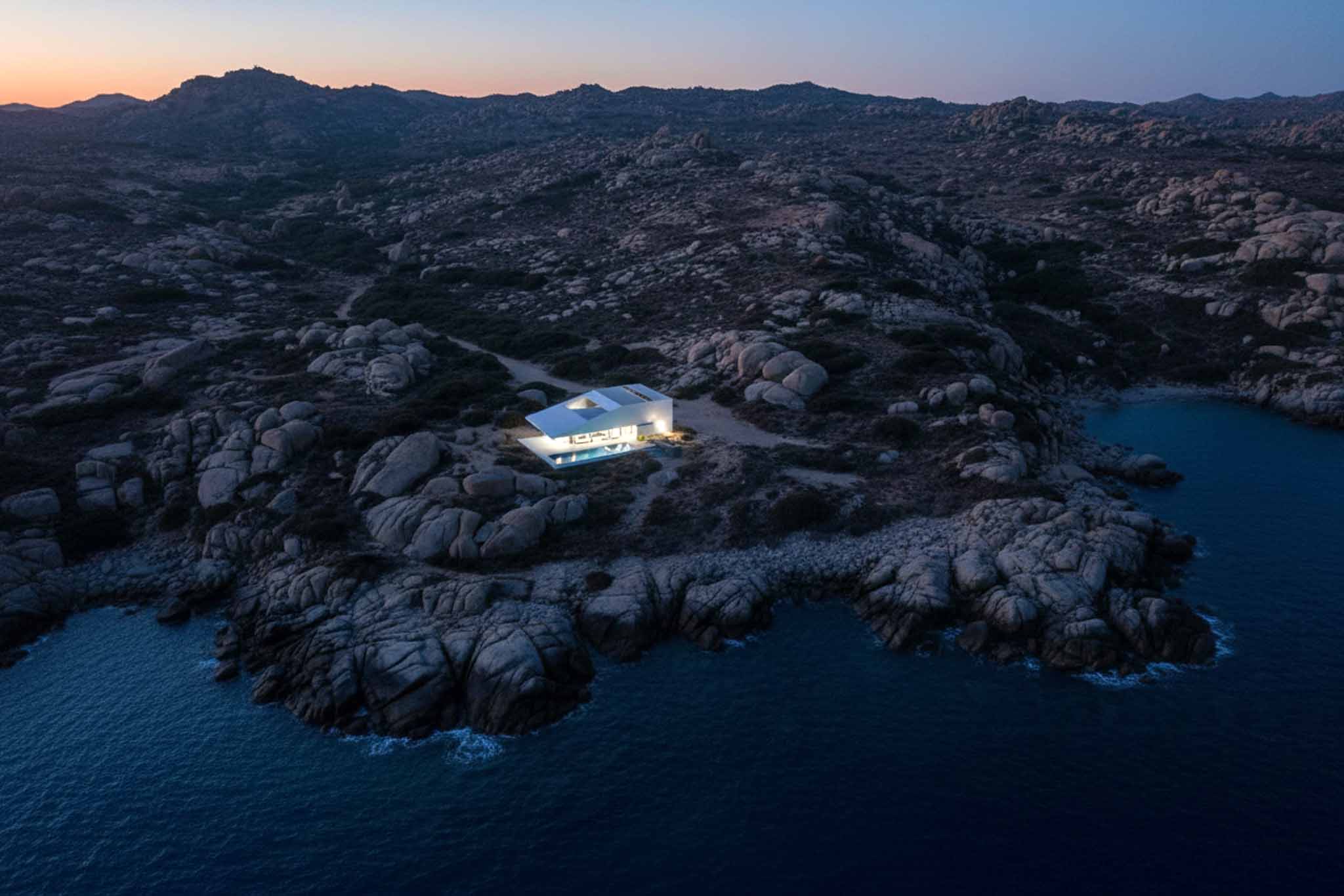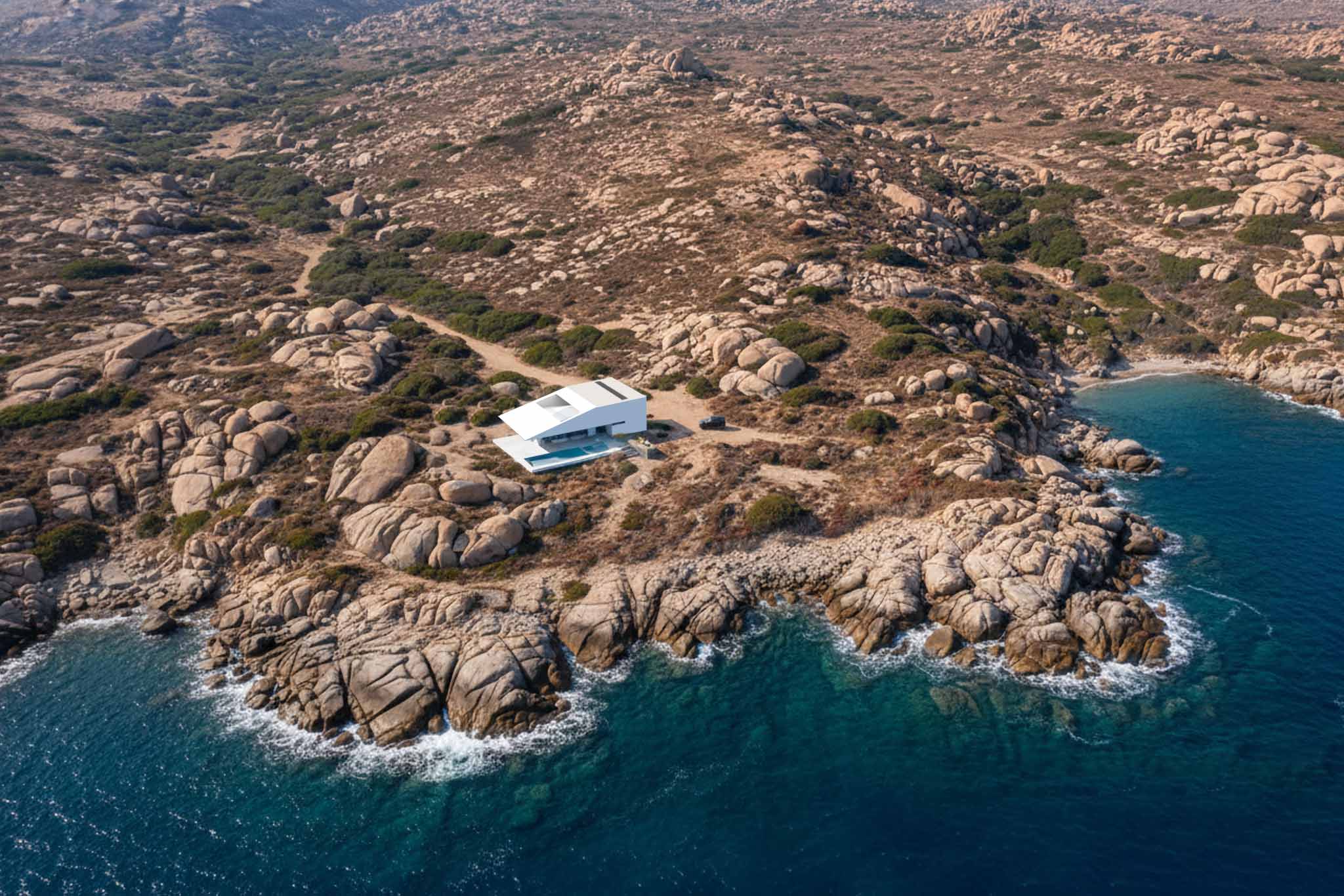 Un volumen blanco, minimalista y suspendido, que se abre completamente al horizonte marino, creando continuidad entre interior y exterior.