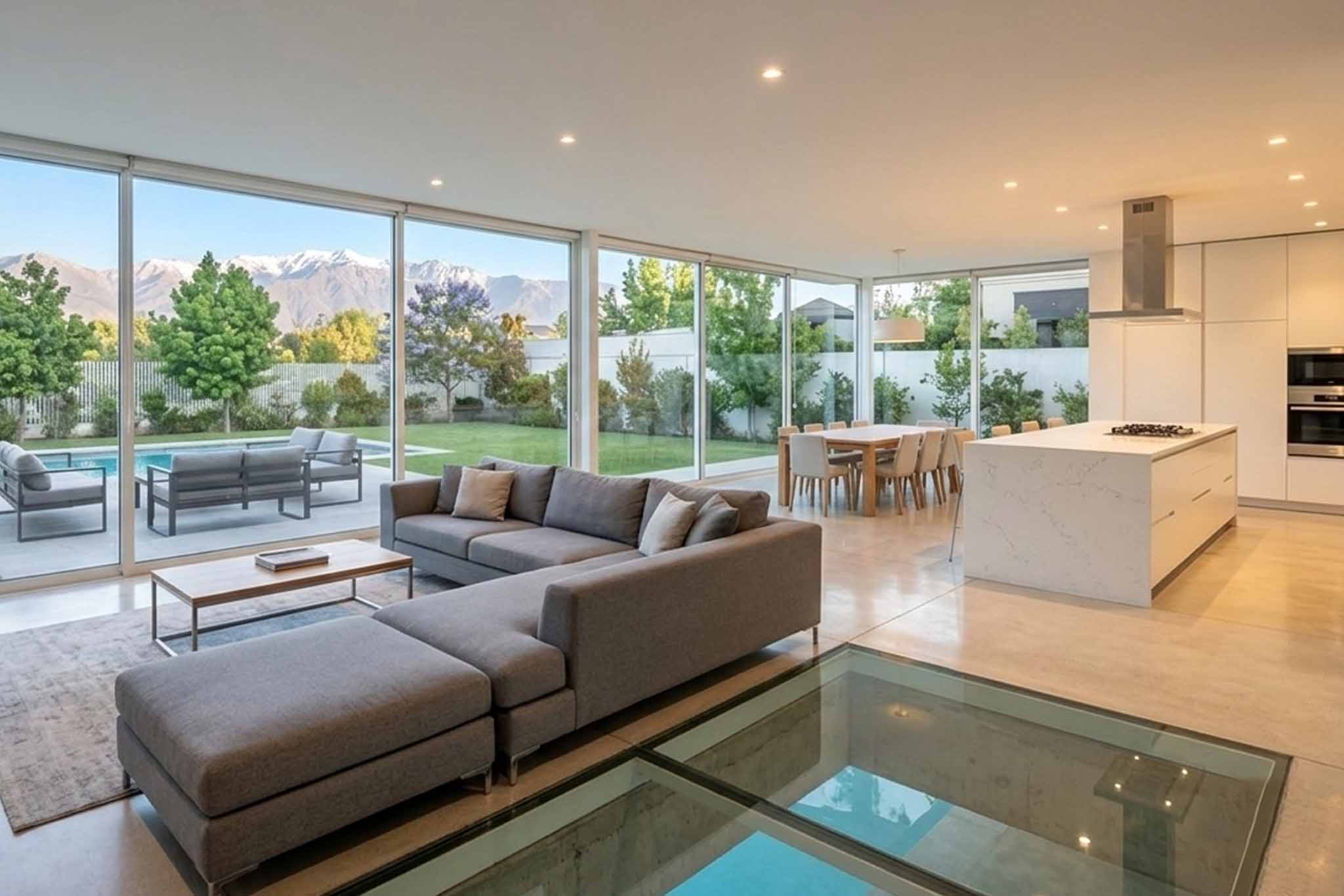 La fachada blanca y abierta permite que la luz fluya hacia el interior, mientras los grandes ventanales disuelven la frontera entre la vida doméstica y el jardín. En su quietud geométrica, la vivienda transmite una sensación de equilibrio y contemplación, como un espacio donde la arquitectura se convierte en un acto de calma, conexión con la naturaleza y armonía interior.